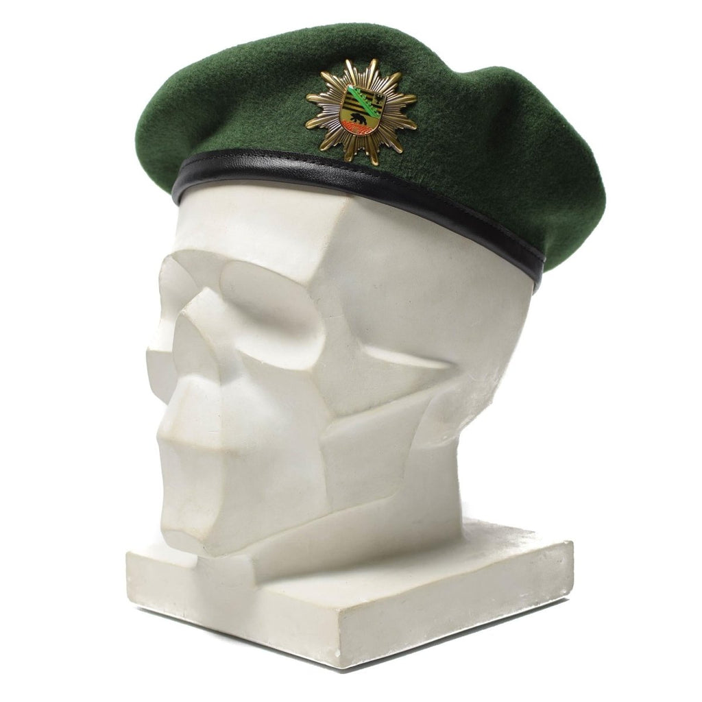 Echtes grünes Barett der deutschen Polizei aus Wolle mit Kokarde aus Metall. NEU