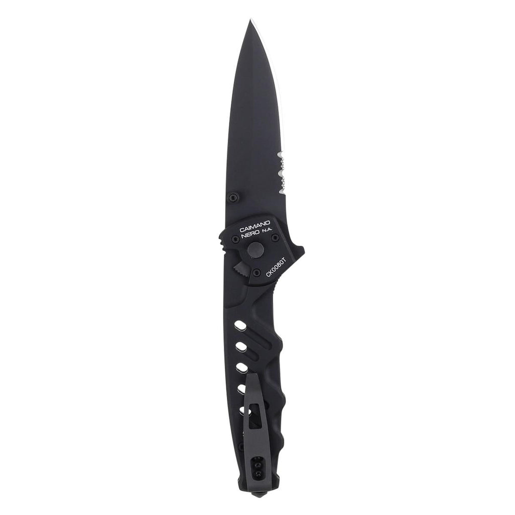 - Der teilweise gezahnte Klinge fügt hinzu zusätzliche Vielseitigkeit, damit Sie es tun können Schneiden Sie härtere Materialien durch mit Leichtigkeit. Es ist komplett schwarzes Finish gibt dem Messer ein schlankes, taktisches Erscheinungsbild, ideal für Militär, Strafverfolgung und Outdoor-Enthusiasten.