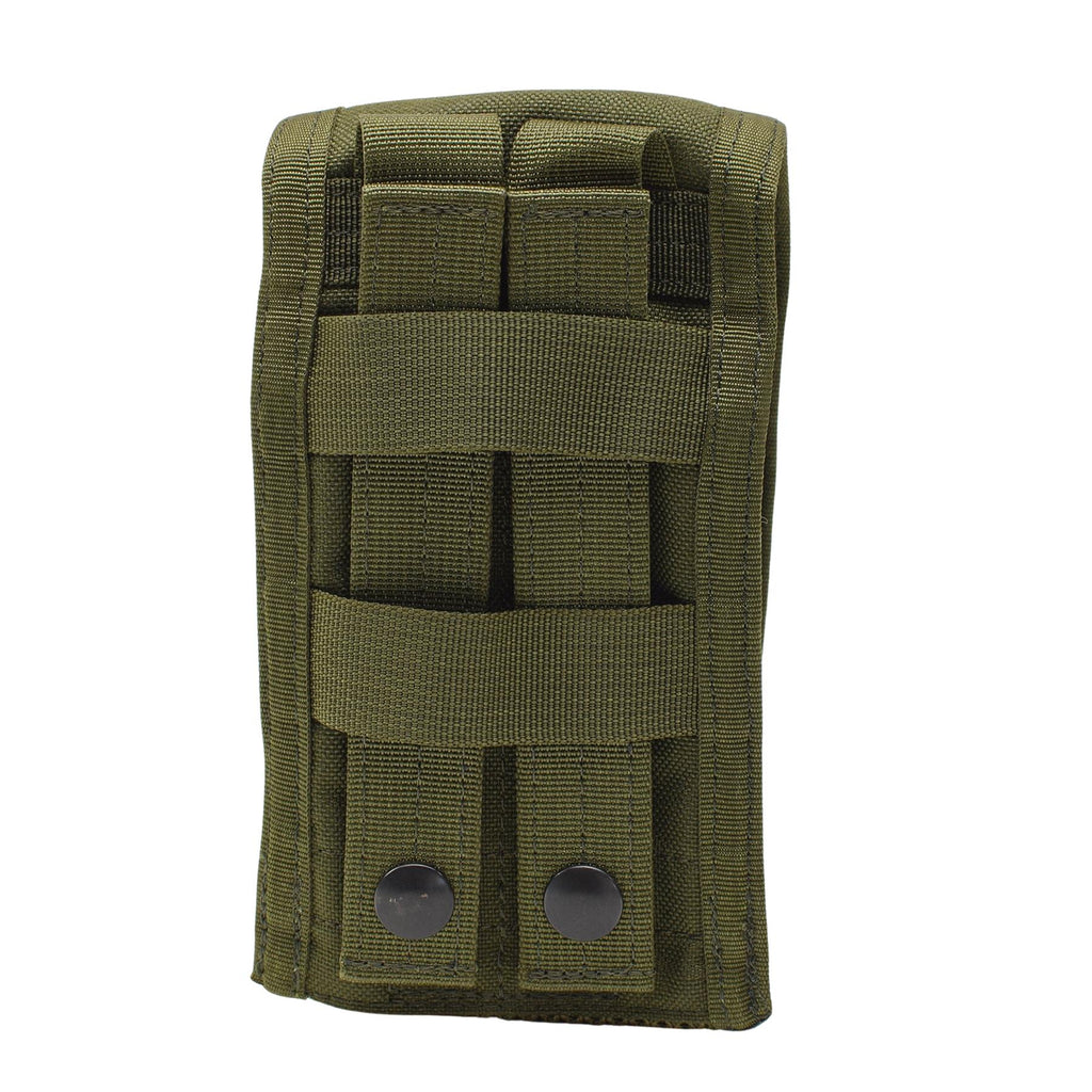 - Diese Tasche aus strapazierfähigem Nylon bietet dauerhafte Leistung unter harten Bedingungen. Ihre olivgrüne Farbe passt gut zu militärischer und taktischer Ausrüstung und bietet eine praktische und vielseitige Aufbewahrungslösung. Die Tasche verfügt über eine sichere Klappe mit Druckknopfverschluss, um sicherzustellen, dass die Magazine sicher an ihrem Platz bleiben.