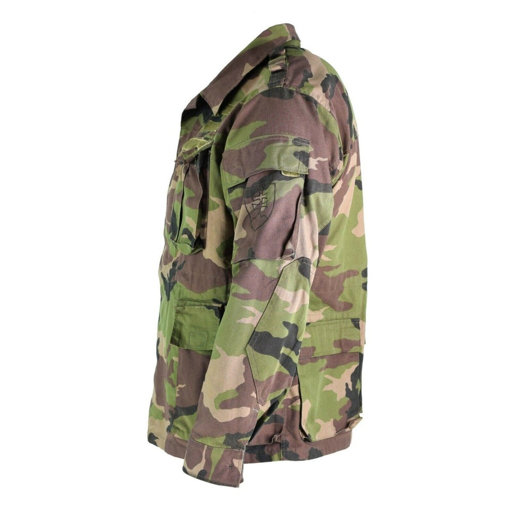Die Original Vintage Slowakische Militärfeldjacke M97 Camouflage ist eine Jacke, die Ende der 1990er Jahre von den slowakischen Streitkräften getragen wurde. Es besteht aus einem strapazierfähigen, wasserabweisenden Material und verfügt über ein Tarnmuster, das sich harmonisch in die Waldumgebung einfügt.